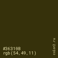 Цвет #36310B в цветовой модели RGB обозначается тремя октетами (54, 49, 11) в десятичном формате и #36310B в шестнадцатиричном (hex) формате, которые являются интенсивностью красного 54 (hex 36), интенсивность зелёного 49 (hex 31) и интенсивность синего 11 (hex 0B).