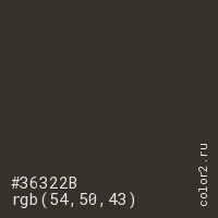 Цвет #36322B в цветовой модели RGB обозначается тремя октетами (54, 50, 43) в десятичном формате и #36322B в шестнадцатиричном (hex) формате, которые являются интенсивностью красного 54 (hex 36), интенсивность зелёного 50 (hex 32) и интенсивность синего 43 (hex 2B).