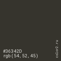 Цвет #36342D в цветовой модели RGB обозначается тремя октетами (54, 52, 45) в десятичном формате и #36342D в шестнадцатиричном (hex) формате, которые являются интенсивностью красного 54 (hex 36), интенсивность зелёного 52 (hex 34) и интенсивность синего 45 (hex 2D).