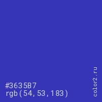 Цвет #3635B7 в цветовой модели RGB обозначается тремя октетами (54, 53, 183) в десятичном формате и #3635B7 в шестнадцатиричном (hex) формате, которые являются интенсивностью красного 54 (hex 36), интенсивность зелёного 53 (hex 35) и интенсивность синего 183 (hex B7).