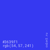 Цвет #3639F1 в цветовой модели RGB обозначается тремя октетами (54, 57, 241) в десятичном формате и #3639F1 в шестнадцатиричном (hex) формате, которые являются интенсивностью красного 54 (hex 36), интенсивность зелёного 57 (hex 39) и интенсивность синего 241 (hex F1).