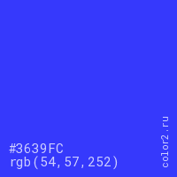 Цвет #3639FC в цветовой модели RGB обозначается тремя октетами (54, 57, 252) в десятичном формате и #3639FC в шестнадцатиричном (hex) формате, которые являются интенсивностью красного 54 (hex 36), интенсивность зелёного 57 (hex 39) и интенсивность синего 252 (hex FC).
