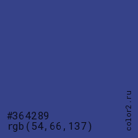 Цвет #364289 в цветовой модели RGB обозначается тремя октетами (54, 66, 137) в десятичном формате и #364289 в шестнадцатиричном (hex) формате, которые являются интенсивностью красного 54 (hex 36), интенсивность зелёного 66 (hex 42) и интенсивность синего 137 (hex 89).