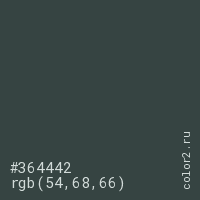 Цвет #364442 в цветовой модели RGB обозначается тремя октетами (54, 68, 66) в десятичном формате и #364442 в шестнадцатиричном (hex) формате, которые являются интенсивностью красного 54 (hex 36), интенсивность зелёного 68 (hex 44) и интенсивность синего 66 (hex 42).