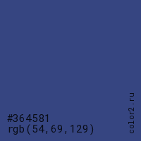 Цвет #364581 в цветовой модели RGB обозначается тремя октетами (54, 69, 129) в десятичном формате и #364581 в шестнадцатиричном (hex) формате, которые являются интенсивностью красного 54 (hex 36), интенсивность зелёного 69 (hex 45) и интенсивность синего 129 (hex 81).