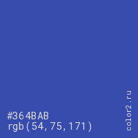 Цвет #364BAB в цветовой модели RGB обозначается тремя октетами (54, 75, 171) в десятичном формате и #364BAB в шестнадцатиричном (hex) формате, которые являются интенсивностью красного 54 (hex 36), интенсивность зелёного 75 (hex 4B) и интенсивность синего 171 (hex AB).
