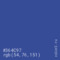 Цвет #364C97 в цветовой модели RGB обозначается тремя октетами (54, 76, 151) в десятичном формате и #364C97 в шестнадцатиричном (hex) формате, которые являются интенсивностью красного 54 (hex 36), интенсивность зелёного 76 (hex 4C) и интенсивность синего 151 (hex 97).