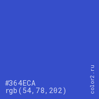 Цвет #364ECA в цветовой модели RGB обозначается тремя октетами (54, 78, 202) в десятичном формате и #364ECA в шестнадцатиричном (hex) формате, которые являются интенсивностью красного 54 (hex 36), интенсивность зелёного 78 (hex 4E) и интенсивность синего 202 (hex CA).