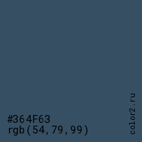 Цвет #364F63 в цветовой модели RGB обозначается тремя октетами (54, 79, 99) в десятичном формате и #364F63 в шестнадцатиричном (hex) формате, которые являются интенсивностью красного 54 (hex 36), интенсивность зелёного 79 (hex 4F) и интенсивность синего 99 (hex 63).