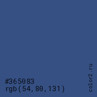 Цвет #365083 в цветовой модели RGB обозначается тремя октетами (54, 80, 131) в десятичном формате и #365083 в шестнадцатиричном (hex) формате, которые являются интенсивностью красного 54 (hex 36), интенсивность зелёного 80 (hex 50) и интенсивность синего 131 (hex 83).