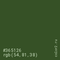 Цвет #365126 в цветовой модели RGB обозначается тремя октетами (54, 81, 38) в десятичном формате и #365126 в шестнадцатиричном (hex) формате, которые являются интенсивностью красного 54 (hex 36), интенсивность зелёного 81 (hex 51) и интенсивность синего 38 (hex 26).