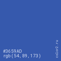 Цвет #3659AD в цветовой модели RGB обозначается тремя октетами (54, 89, 173) в десятичном формате и #3659AD в шестнадцатиричном (hex) формате, которые являются интенсивностью красного 54 (hex 36), интенсивность зелёного 89 (hex 59) и интенсивность синего 173 (hex AD).