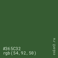 Цвет #365C32 в цветовой модели RGB обозначается тремя октетами (54, 92, 50) в десятичном формате и #365C32 в шестнадцатиричном (hex) формате, которые являются интенсивностью красного 54 (hex 36), интенсивность зелёного 92 (hex 5C) и интенсивность синего 50 (hex 32).