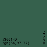 Цвет #36614D в цветовой модели RGB обозначается тремя октетами (54, 97, 77) в десятичном формате и #36614D в шестнадцатиричном (hex) формате, которые являются интенсивностью красного 54 (hex 36), интенсивность зелёного 97 (hex 61) и интенсивность синего 77 (hex 4D).