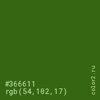 Цвет #366611 в цветовой модели RGB обозначается тремя октетами (54, 102, 17) в десятичном формате и #366611 в шестнадцатиричном (hex) формате, которые являются интенсивностью красного 54 (hex 36), интенсивность зелёного 102 (hex 66) и интенсивность синего 17 (hex 11).