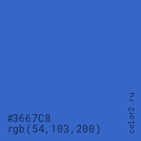 Цвет #3667C8 в цветовой модели RGB обозначается тремя октетами (54, 103, 200) в десятичном формате и #3667C8 в шестнадцатиричном (hex) формате, которые являются интенсивностью красного 54 (hex 36), интенсивность зелёного 103 (hex 67) и интенсивность синего 200 (hex C8).