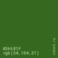 Цвет #36681F в цветовой модели RGB обозначается тремя октетами (54, 104, 31) в десятичном формате и #36681F в шестнадцатиричном (hex) формате, которые являются интенсивностью красного 54 (hex 36), интенсивность зелёного 104 (hex 68) и интенсивность синего 31 (hex 1F).