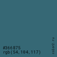 Цвет #366875 в цветовой модели RGB обозначается тремя октетами (54, 104, 117) в десятичном формате и #366875 в шестнадцатиричном (hex) формате, которые являются интенсивностью красного 54 (hex 36), интенсивность зелёного 104 (hex 68) и интенсивность синего 117 (hex 75).
