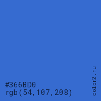 Цвет #366BD0 в цветовой модели RGB обозначается тремя октетами (54, 107, 208) в десятичном формате и #366BD0 в шестнадцатиричном (hex) формате, которые являются интенсивностью красного 54 (hex 36), интенсивность зелёного 107 (hex 6B) и интенсивность синего 208 (hex D0).