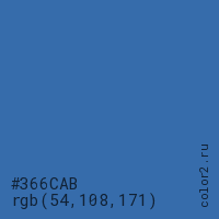 Цвет #366CAB в цветовой модели RGB обозначается тремя октетами (54, 108, 171) в десятичном формате и #366CAB в шестнадцатиричном (hex) формате, которые являются интенсивностью красного 54 (hex 36), интенсивность зелёного 108 (hex 6C) и интенсивность синего 171 (hex AB).