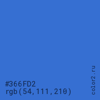 Цвет #366FD2 в цветовой модели RGB обозначается тремя октетами (54, 111, 210) в десятичном формате и #366FD2 в шестнадцатиричном (hex) формате, которые являются интенсивностью красного 54 (hex 36), интенсивность зелёного 111 (hex 6F) и интенсивность синего 210 (hex D2).