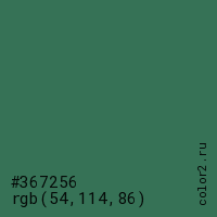 Цвет #367256 в цветовой модели RGB обозначается тремя октетами (54, 114, 86) в десятичном формате и #367256 в шестнадцатиричном (hex) формате, которые являются интенсивностью красного 54 (hex 36), интенсивность зелёного 114 (hex 72) и интенсивность синего 86 (hex 56).