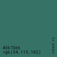 Цвет #367366 в цветовой модели RGB обозначается тремя октетами (54, 115, 102) в десятичном формате и #367366 в шестнадцатиричном (hex) формате, которые являются интенсивностью красного 54 (hex 36), интенсивность зелёного 115 (hex 73) и интенсивность синего 102 (hex 66).