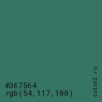 Цвет #367564 в цветовой модели RGB обозначается тремя октетами (54, 117, 100) в десятичном формате и #367564 в шестнадцатиричном (hex) формате, которые являются интенсивностью красного 54 (hex 36), интенсивность зелёного 117 (hex 75) и интенсивность синего 100 (hex 64).