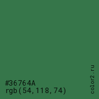 Цвет #36764A в цветовой модели RGB обозначается тремя октетами (54, 118, 74) в десятичном формате и #36764A в шестнадцатиричном (hex) формате, которые являются интенсивностью красного 54 (hex 36), интенсивность зелёного 118 (hex 76) и интенсивность синего 74 (hex 4A).