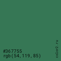 Цвет #367755 в цветовой модели RGB обозначается тремя октетами (54, 119, 85) в десятичном формате и #367755 в шестнадцатиричном (hex) формате, которые являются интенсивностью красного 54 (hex 36), интенсивность зелёного 119 (hex 77) и интенсивность синего 85 (hex 55).