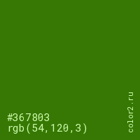 Цвет #367803 в цветовой модели RGB обозначается тремя октетами (54, 120, 3) в десятичном формате и #367803 в шестнадцатиричном (hex) формате, которые являются интенсивностью красного 54 (hex 36), интенсивность зелёного 120 (hex 78) и интенсивность синего 3 (hex 03).