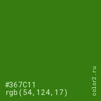 Цвет #367C11 в цветовой модели RGB обозначается тремя октетами (54, 124, 17) в десятичном формате и #367C11 в шестнадцатиричном (hex) формате, которые являются интенсивностью красного 54 (hex 36), интенсивность зелёного 124 (hex 7C) и интенсивность синего 17 (hex 11).