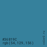 Цвет #36819C в цветовой модели RGB обозначается тремя октетами (54, 129, 156) в десятичном формате и #36819C в шестнадцатиричном (hex) формате, которые являются интенсивностью красного 54 (hex 36), интенсивность зелёного 129 (hex 81) и интенсивность синего 156 (hex 9C).