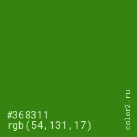 Цвет #368311 в цветовой модели RGB обозначается тремя октетами (54, 131, 17) в десятичном формате и #368311 в шестнадцатиричном (hex) формате, которые являются интенсивностью красного 54 (hex 36), интенсивность зелёного 131 (hex 83) и интенсивность синего 17 (hex 11).