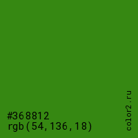 Цвет #368812 в цветовой модели RGB обозначается тремя октетами (54, 136, 18) в десятичном формате и #368812 в шестнадцатиричном (hex) формате, которые являются интенсивностью красного 54 (hex 36), интенсивность зелёного 136 (hex 88) и интенсивность синего 18 (hex 12).