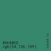 Цвет #36886D в цветовой модели RGB обозначается тремя октетами (54, 136, 109) в десятичном формате и #36886D в шестнадцатиричном (hex) формате, которые являются интенсивностью красного 54 (hex 36), интенсивность зелёного 136 (hex 88) и интенсивность синего 109 (hex 6D).