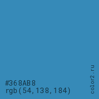 Цвет #368AB8 в цветовой модели RGB обозначается тремя октетами (54, 138, 184) в десятичном формате и #368AB8 в шестнадцатиричном (hex) формате, которые являются интенсивностью красного 54 (hex 36), интенсивность зелёного 138 (hex 8A) и интенсивность синего 184 (hex B8).