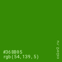 Цвет #368B05 в цветовой модели RGB обозначается тремя октетами (54, 139, 5) в десятичном формате и #368B05 в шестнадцатиричном (hex) формате, которые являются интенсивностью красного 54 (hex 36), интенсивность зелёного 139 (hex 8B) и интенсивность синего 5 (hex 05).