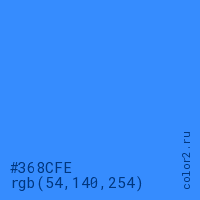 Цвет #368CFE в цветовой модели RGB обозначается тремя октетами (54, 140, 254) в десятичном формате и #368CFE в шестнадцатиричном (hex) формате, которые являются интенсивностью красного 54 (hex 36), интенсивность зелёного 140 (hex 8C) и интенсивность синего 254 (hex FE).