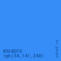 Цвет #368DF8 в цветовой модели RGB обозначается тремя октетами (54, 141, 248) в десятичном формате и #368DF8 в шестнадцатиричном (hex) формате, которые являются интенсивностью красного 54 (hex 36), интенсивность зелёного 141 (hex 8D) и интенсивность синего 248 (hex F8).