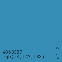 Цвет #368EB7 в цветовой модели RGB обозначается тремя октетами (54, 142, 183) в десятичном формате и #368EB7 в шестнадцатиричном (hex) формате, которые являются интенсивностью красного 54 (hex 36), интенсивность зелёного 142 (hex 8E) и интенсивность синего 183 (hex B7).