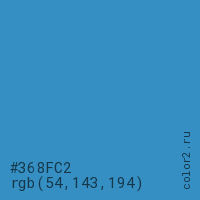 Цвет #368FC2 в цветовой модели RGB обозначается тремя октетами (54, 143, 194) в десятичном формате и #368FC2 в шестнадцатиричном (hex) формате, которые являются интенсивностью красного 54 (hex 36), интенсивность зелёного 143 (hex 8F) и интенсивность синего 194 (hex C2).