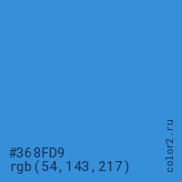 Цвет #368FD9 в цветовой модели RGB обозначается тремя октетами (54, 143, 217) в десятичном формате и #368FD9 в шестнадцатиричном (hex) формате, которые являются интенсивностью красного 54 (hex 36), интенсивность зелёного 143 (hex 8F) и интенсивность синего 217 (hex D9).