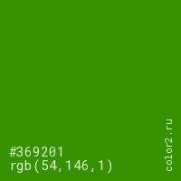 Цвет #369201 в цветовой модели RGB обозначается тремя октетами (54, 146, 1) в десятичном формате и #369201 в шестнадцатиричном (hex) формате, которые являются интенсивностью красного 54 (hex 36), интенсивность зелёного 146 (hex 92) и интенсивность синего 1 (hex 01).