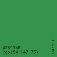 Цвет #36934B в цветовой модели RGB обозначается тремя октетами (54, 147, 75) в десятичном формате и #36934B в шестнадцатиричном (hex) формате, которые являются интенсивностью красного 54 (hex 36), интенсивность зелёного 147 (hex 93) и интенсивность синего 75 (hex 4B).