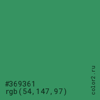 Цвет #369361 в цветовой модели RGB обозначается тремя октетами (54, 147, 97) в десятичном формате и #369361 в шестнадцатиричном (hex) формате, которые являются интенсивностью красного 54 (hex 36), интенсивность зелёного 147 (hex 93) и интенсивность синего 97 (hex 61).