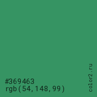 Цвет #369463 в цветовой модели RGB обозначается тремя октетами (54, 148, 99) в десятичном формате и #369463 в шестнадцатиричном (hex) формате, которые являются интенсивностью красного 54 (hex 36), интенсивность зелёного 148 (hex 94) и интенсивность синего 99 (hex 63).