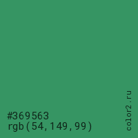 Цвет #369563 в цветовой модели RGB обозначается тремя октетами (54, 149, 99) в десятичном формате и #369563 в шестнадцатиричном (hex) формате, которые являются интенсивностью красного 54 (hex 36), интенсивность зелёного 149 (hex 95) и интенсивность синего 99 (hex 63).