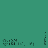 Цвет #369574 в цветовой модели RGB обозначается тремя октетами (54, 149, 116) в десятичном формате и #369574 в шестнадцатиричном (hex) формате, которые являются интенсивностью красного 54 (hex 36), интенсивность зелёного 149 (hex 95) и интенсивность синего 116 (hex 74).