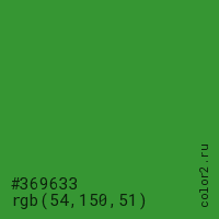 Цвет #369633 в цветовой модели RGB обозначается тремя октетами (54, 150, 51) в десятичном формате и #369633 в шестнадцатиричном (hex) формате, которые являются интенсивностью красного 54 (hex 36), интенсивность зелёного 150 (hex 96) и интенсивность синего 51 (hex 33).